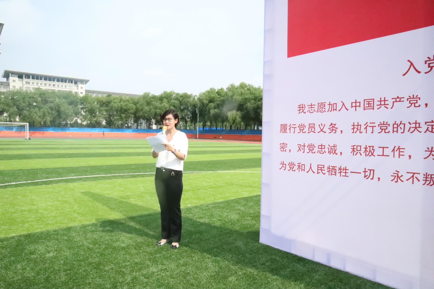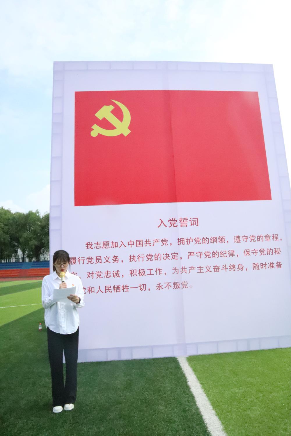 田径场上响起铿锵有力的宣誓声,在张艳波副书记的带领下,500多名新老党员,整齐列队,佩戴党徽,举起右拳,面向党旗,庄严宣誓。铮铮誓言,字字铿锵,表达了每一名新党员对党的忠心和为共产主义事业奋斗终生的决心。